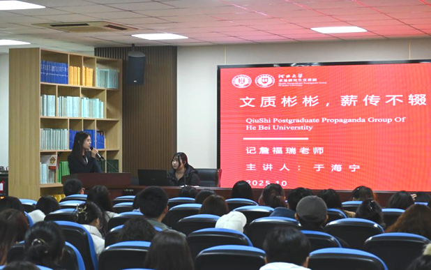 随后,研究生宣讲团于海宁同学带来《文质彬彬,薪传不辍——记詹福瑞先生》主题培训。她围绕詹福瑞先生的学术经历与治学精神展开分享,结合学校“双一流”学科建设目标,阐释詹福瑞先生理念的意义,鼓励全体成员传承优良学风。