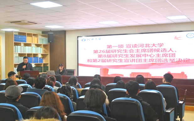 首先,由刘冲老师宣读河北大学第26届研究生会主席团候选人、第8届研究生发展中心主席团和第2届“求是”研究生宣讲团主席团选举决定,并与主席团成员合影留念。