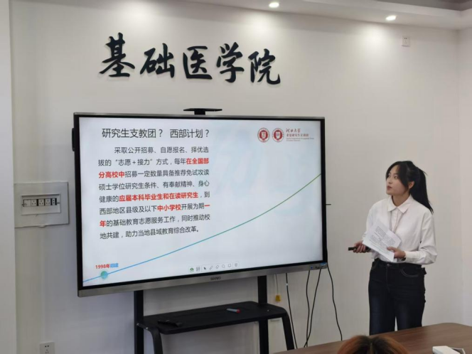 河北大学“求是”研究生宣讲团讲师王婧洋开展了以“逐梦西部献青春,服务基层显担当”为题目的专题讲座,为大家系统讲解了有关研究生支教团和西部计划的相关知识,并结合自己支教工作经历,为大家带来了一堂生动的“国情课”和“思政课”。启示我们,青年的成长成才必须与国家的命运紧密相连,在实践中筑牢信仰之基。